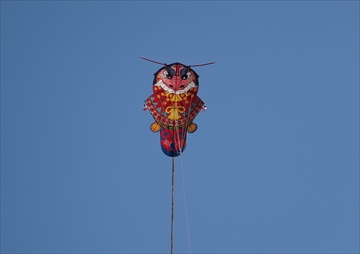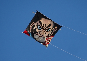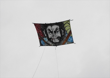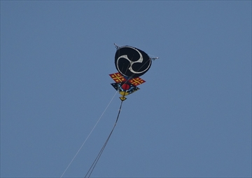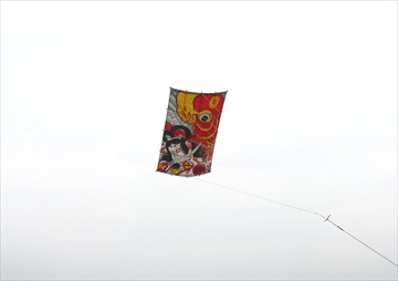 強風の中、安定して揚がる鶴亀の「ぶか凧」