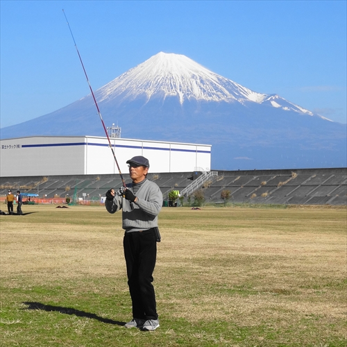 ↓富士山を背に凧揚げをする裕佑さん